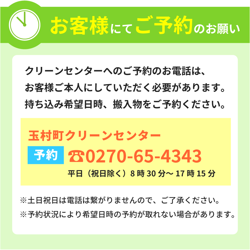 玉村町のクリーンセンターにお客様ご本人で電話予約が必要となります。予約後、まなかが持ち込みいたします。